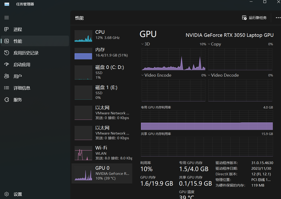 确定自己的电脑是否有独显,也可以通俗的说是否有英伟达的GPU,可以通过打开任务管理器然后查看自己的显卡,我的电脑是3050,你们估计都4060起步了吧。